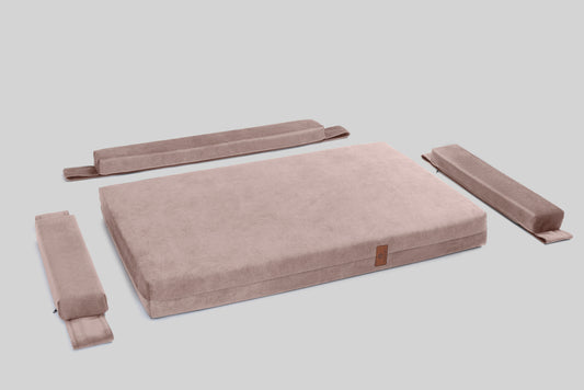 You think transformers can only be in movies? Wrong! Probably first ever modular dog beds. 2 sides, 3 pillows, super easy to clean matte velvet-like upholstery with NANO. You like it with one pillow - put one, like it with two - put two, like it with three - put three! Can also flip it - both sides are perfectly usable! For the creative ones.